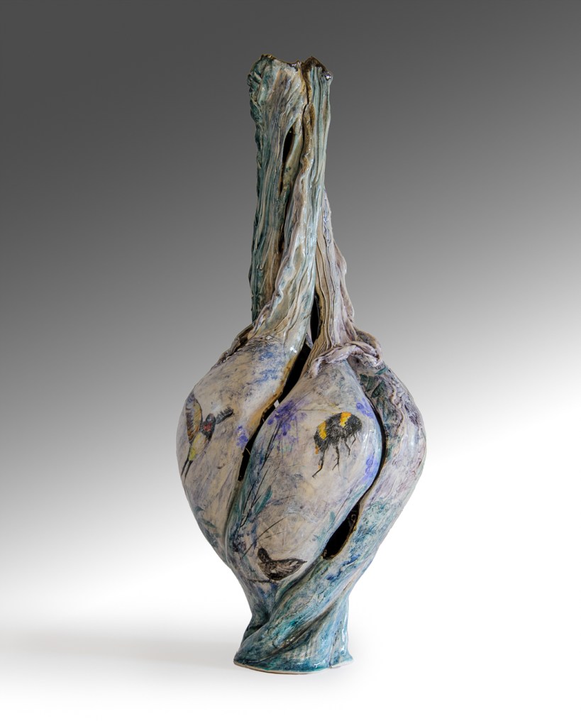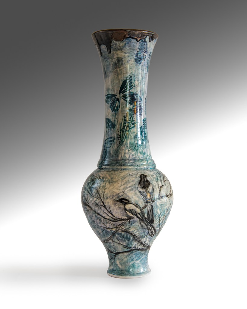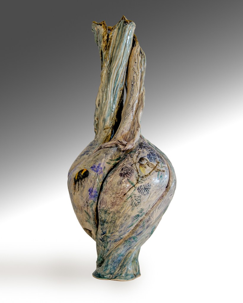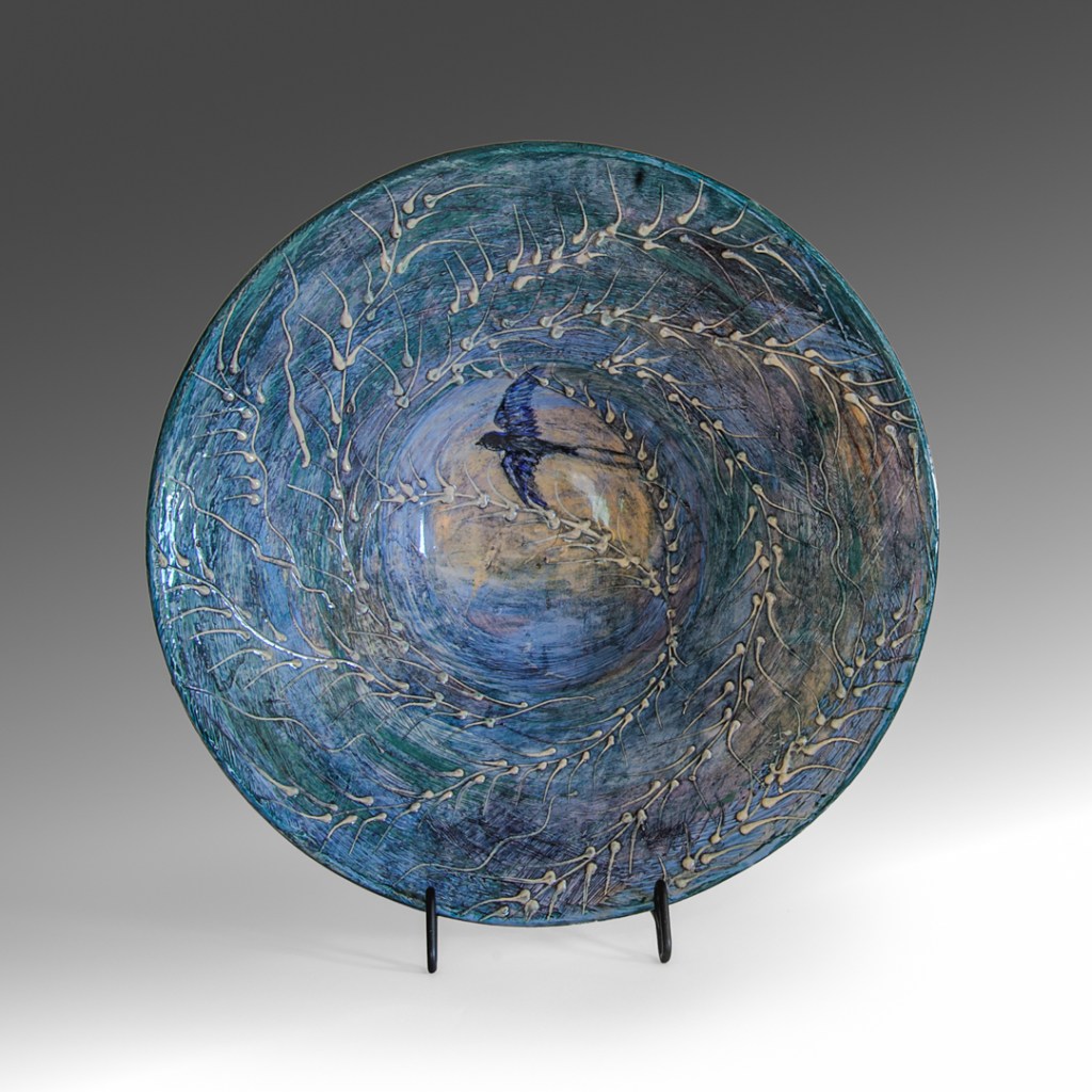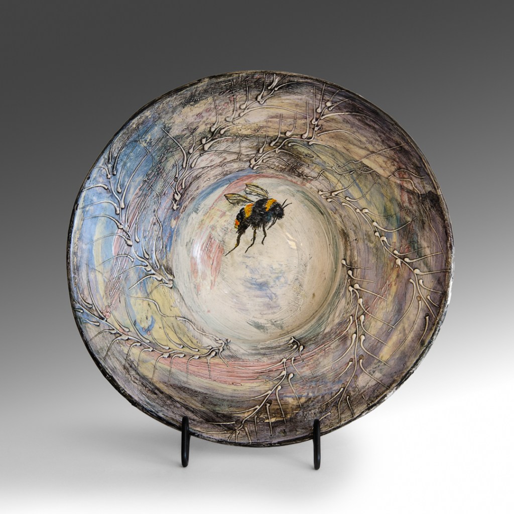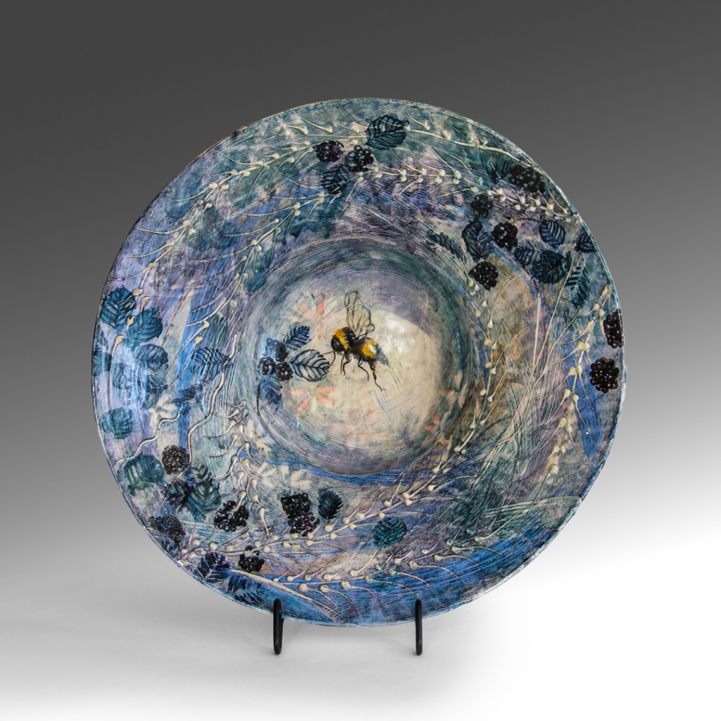 This wall piece is called “Jam Making” a memory from a time when all gathered & picked blackberries (blacka’s) together old & young. Jams were made and shared among friends & family. Purple blush children braved the thorns to reach fat juicy ones up high.